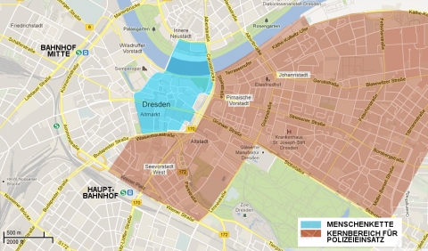 Als Startpunkt für die Nazidemonstration wurde bisher der Sachsenplatz unweit des Dresdner Landgerichtes angegeben. Da auch die Polizei die Pirnaische Vorstadt, Johannstadt und die Seevorstadt zum „Kerneinsatzgebiet“ erklärt hat, lässt vermuten, dass es sich dabei nur um eine Ablenkung handelt, um die für 18 Uhr angemeldete Nazidemonstration an anderer Stelle ohne Störungen zuzulassen. Denkbar sind Demonstrationsszenarien wie im vergangenen Jahr, als die Nazis bei ihrem Versuch kläglich gescheitert waren, durch die Seevorstadt zu ziehen. Vorstellbar ist auch eine Route wie vor zwei Jahren. Damals hatten etwa 1.300 Nazis ungestört in Teilen der Südvorstadt demonstriert, während die Stadt gleichzeitig den auch für dieses Jahr geplanten Rundgang „Täterspuren“ verboten hatte. Generell muss in der gesamten Innenstadt mit Verkehrsproblemen und umfangreichen Personenkontrollen durch die Polizei gerechnet werden.