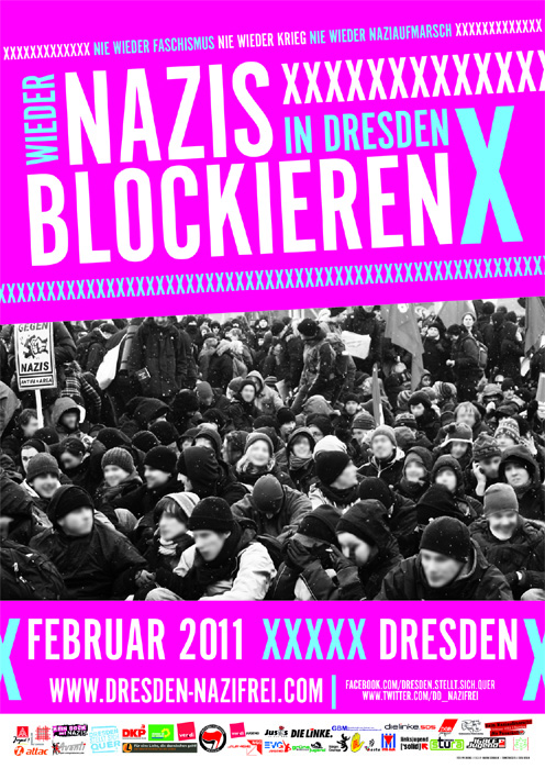 Das Bündnis „Dresden Nazifrei“ hat dazu aufgerufen, die für den 19. Februar geplanten Naziaufmärsche wie im vergangenen Jahr mit Massenblockaden zu verhindern. Für einen ebenfalls angemeldeten Fackelaufmarsch am Jahrestag der Luftangriffe in den Abendstunden des 13. Februars, rufen sie die Dresdner Bevölkerung zu öffentlichkeitswirksamen und vielfältigen Aktionen auf. Am kommenden Wochenende sind außerdem am bundesweiten Aktionstag Blockadetrainings und Infoveranstaltungen in zahlreichen Städten geplant.