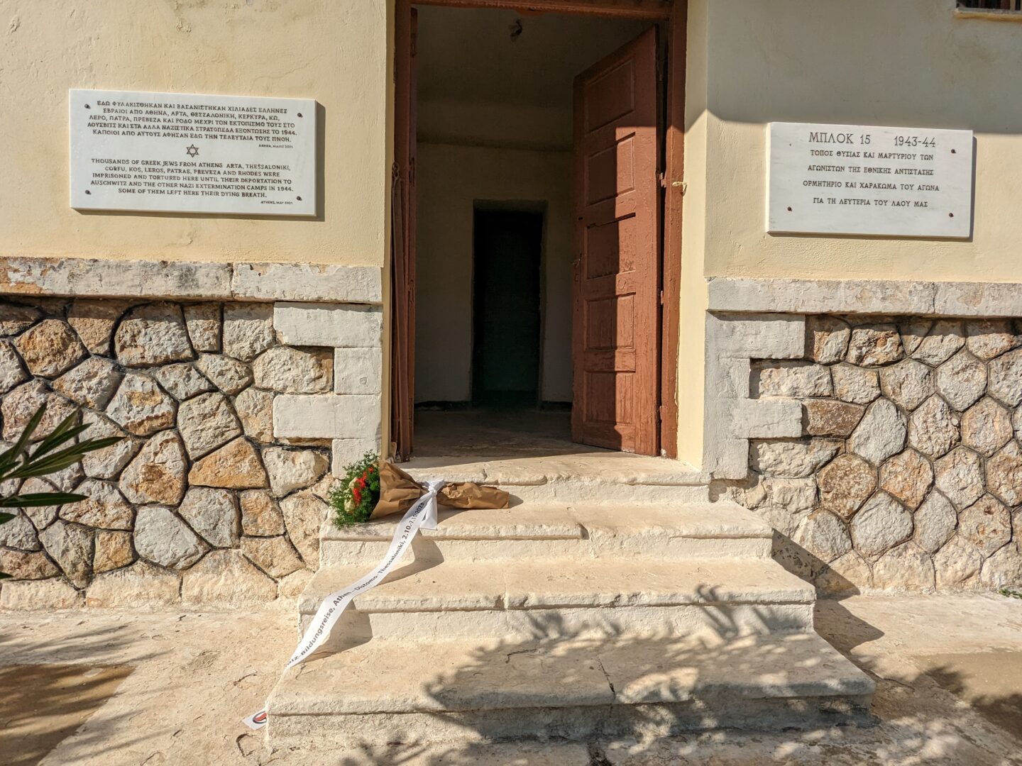 Heute erinnert eine schlichte Gedenktafel auf der rechten Seite des Eingangs an das Martyrium, der hier gefangenen Widerstandskämpfer:innen – eine weitere 2021 angebrachte Gedenktafel an die hier inhaftierten Jüdinnen:Juden. Der Block 15 steht zwar seit den 1980er Jahren unter Denkmalschutz, befindet sich allerdings auf militärischem Sperrgebiet und ist somit für die Öffentlichkeit nur mit einer Sondergenehmigung zugänglich. Wir legten vor dem Eingang zu Block 15 Blumen ab und erinnerten an Lela Karagianni. Die von ihr gegründete Undergrundorganisation Bouboulina fälschte Ausweispapiere und organisierte sichere Unterkünfte. Auch half sie, gefährdeten Menschen, zu den Partisan:innen oder ins Ausland zu flüchten, so auch vielen Jüdinnen:Juden, u.a. der aus Thessaloniki stammenden Familie Samuel Cohen. Lela Karagianni wurde am 11. Juli 1944 verhaftet, gefoltert und anschließend in das Konzentrationslager Chaidari gebracht. Zusammen mit 71 Mitgliedern der Bouboulina-Organisation wurde sie am 8. September 1944 im Wald von Daphni erschossen. Im Jahr 2011 wurde Lela Karagianni durch die israelische Gedenkstätte Yad Vashem als Gerechte unter den Völkern ausgezeichnet.