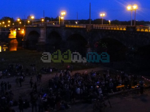 Gleichzeitig zur geplanten Abschiebung einer 22jährigen Roma fand auf den Dresdner Elbwiesen unweit der Albertbrücke ein 8. Mai Befreiungs Open Air statt an dem sich in diesem Jahr knapp 400 Menschen beteiligten. Mit Feuerwerk, Transparenten und elektronischer Musik wurde unter den Augen der Polizei bis 22 Uhr an den 67. Jahrestag der Befreiung erinnert. Während es in Dresden von offizieller Seite auch auf Nachfrage in diesem Jahr keine öffentliche Veranstaltung zu dem Thema gibt und stattdessen von der Stadt auf den alljährlichen Trauermarathon im Februar (!) und den Tag der Deutschen Einheit verwiesen wird, zeigten die zumeist jungen Menschen nun schon zum dritten Mal in Folge, dass der 8. Mai und die militärische Zerschlagung Nazideutschlands auch ein Grund zum Feiern sein kann.