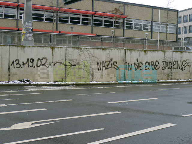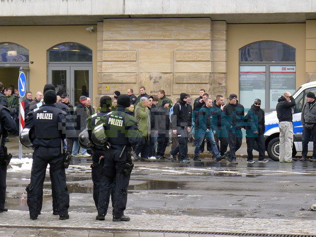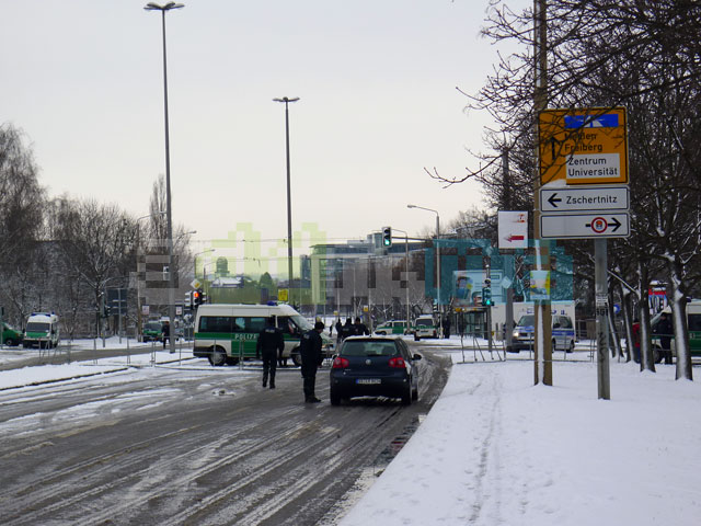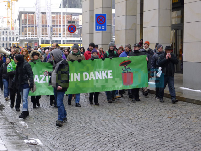 Gegen 15 Uhr hatte sich an der Münchner Straße, Ecke Bergstraße eine Gruppe von lautstark Protestierenden von mehreren hundert auf knapp 1.500 Menschen erhöht (Fotos 1 | 2). Während der angemeldeten Kundgebung nimmt die Polizei immer wieder von zumeist jugendlichen Teilnehmerinnen und Teilnehmern wegen der winterlichen Vermummung die Personalien auf. Nachdem sich gegen 17.15 Uhr der Demonstrationszug der mehr als 1.000 angereisten Nazis in Richtung Strehlener Straße in Bewegung setzt, versuchen etwa zweihundert linke Demonstrantinnen und Demonstranten zum Nürnberger Platz zu laufen. Obwohl der Versuch von der Polizei gewaltsam verhindert werden kann, beschließt die Einsatzleitung eine Verkürzung der Naziroute vom Zelleschen Weg auf die Reichenbachstraße. Wenig später war der nunmehr schon 14. Naziaufmarsch an einem 13. Februar schon wieder Geschichte.