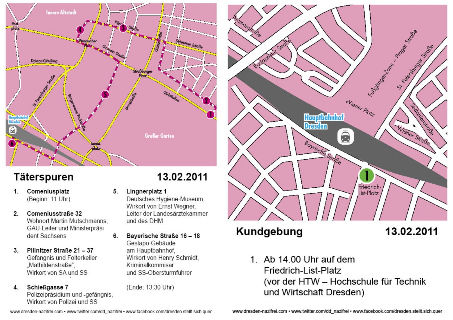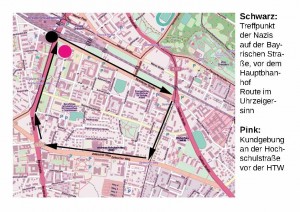 Ebenfalls am Hauptbahnhof hat das Bündnis „Dresden Nazifrei“ um 14 Uhr eine Kundgebung vor der HTW Dresden auf dem Friedrich-List-Platz angemeldet. Die Veranstaltung wurde, genauso wie ein geplanter Erinnerungsspaziergang um 11 Uhr am Comeniusplatz und einer Mahnwache der Grünen vor dem Rathaus vom Dresdner Ordnungsamt verboten. Das Oberverwaltungsgericht in Bautzen bestätigte gestern Abend das Verbot „in Anbetracht der vielen (nicht existierenden, Anm. d. Verf.) Blockadeaufrufe“. Der Spaziergang „Täterspuren“ war als offensive Auseinandersetzung mit der nationalsozialistischen Vergangenheit der Stadt geplant und wurde von namhaften Prominenten und Schauspielern unterstützt. Damit wurde auf der Altstädter Elbseite neben den angemeldeten Versammlungen der JLO, sowie der Menschenkette, nur eine vom Kulturbüro angemeldete Kundgebung vor der Synagoge genehmigt.