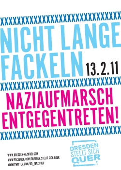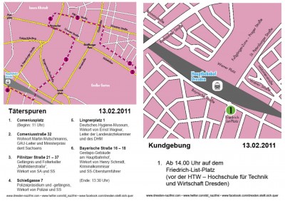 Am 13. Februar werden wie in den vergangenen Jahren auch, Nazis durch Dresden marschieren. Nachdem der Tag im letzten Jahr auf einen Samstag fiel, mobilisieren die Nazis wie schon 2008 und 2009 zu zwei großen Demonstrationen nach Dresden. Vor dem abendlichen Aufmarsch von mindestens 1.500 alten und neuen Nazis finden in der Stadt mehrere Veranstaltungen mit Bezug zu den alliierten Bombardierungen vor 66 Jahren statt. Während am frühen Mittag die offiziellen Gedenkfeierlichkeiten von Vertreterinnen und Vertretern aus Politik und Zivilgesellschaft auf dem Heidefriedhof stattfinden, hat die Partei Die Linke vor dem Neustädter Bahnhof um 9.30 Uhr eine Kundgebung angemeldet. Um 10 Uhr ist ebenfalls eine Kundgebung auf der Bautzner Straße Ecke Alaunstraße unter dem Motto „Gegen jeden Geschichtsrevisionismus!“ geplant.