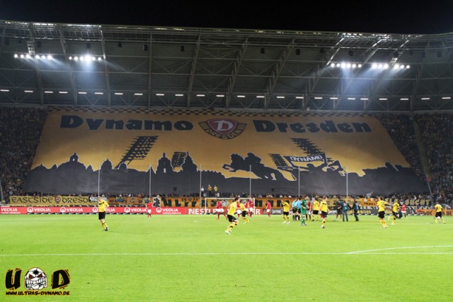 Nachdem die Ultras des Heimvereins zu Beginn des Spiels mit einer schon im Vorfeld bekannt gewordenen neuen 70×35 Meter großen Blockfahne die eigenen Fans auf das Spiel eingestimmt hatten, konterten einige der Gäste aus Frankfurt mit einem eigenen Entwurf der Dresdner Fahne. Darauf war die Silhouette der Stadt zu sehen, über welche der Spruch „Bomben auf Dynamo“ zu lesen war. Auch während das Spiels wurden dem Anlass entsprechend immer wieder verbale Nettigkeiten zwischen den beiden Lagern ausgetauscht, die in der zweiten Halbzeit ihren vorläufigen Höhepunkt fanden. Nachdem einige Anhänger des Dresdner Vereins die Gästefans mit „Dönerverkäufer“-Rufen, Hitlergrüßen und Halbmond-Fahnen provoziert hatten, konterten diese mit lautstarken „Nazischweine“ Rufen in Richtung der vermeintlichen Täter.