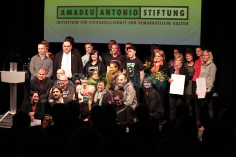 Vor der eigentlichen Preisverleihung eröffnete Dorothee Freudenberg als Mitglied des Kuratoriums der Freudenberg-Stiftung die Veranstaltung und erinnerte dazu an die historischen Hintergründe des Tages. Die Jury hatte im Vorfeld aus 56 Initiativen zehn herausgesucht, die ihrer Ansicht nach im besonderen Maße einen der zehn ausgelobten Preise verdient gehabt hätten. Die acht Anerkennungspreise in Höhe von jeweils 1.000 Euro gingen an die Initiative „Bunter Brühl“ aus Chemnitz, die Radioinitiative coloRadio, das Fanprojekt Dresden, das Netzwerk für Demokratische Kultur aus Wurzen, die Soziale und Politische Bildungsvereinigung Limbach-Oberfrohna und die Migrantenselbstorganisation „WIR – Gemeinsam in Zwickau“. Bereits zum zweiten Mal durfte sich die Lausitzer Initiative „Bunter Schall als Widerhall“ und die Kulturfabrik Hoyerswerda bzw. die RAA Ostsachsen / Hoyerswerda e.V. über einen Preis und damit die Anerkennung ihrer oft ehrenamtlichen Arbeit freuen.