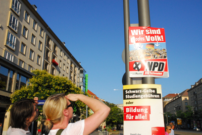 Die originelle „Verfremdung“ der NPD-Wahlkampfplakate fand viel Beifall bei Touristinnen und Touristen und auch in der Dresdener Bevölkerung – Bemerkungen wie „Sehr gut, weiter so“ oder „Das müssten viel mehr Leute machen“ begleiteten die kreative Aktion der ver.di Jugend-Aktiven.