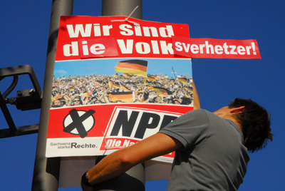 Die Wahlplakate der NPD in der sächsischen Landeshauptstadt waren das Ziel der ver.di Jugend, die am Donnerstagabend mit einem kreativen Einsatz den Landtagswahlkampf der rechtsextremen Partei störte. Mit ihrer „Adbusting“ genannten Aktion nahm die Gewerkschaftsjugend die für die Landtagswahl Ende August geklebten Wahlplakate aufs Korn. „Handschellen für uns Ganoven“, „Vernunft statt NPD“ oder „Höchststrafe für Inder-Schänder“ war in Dresden zu lesen.