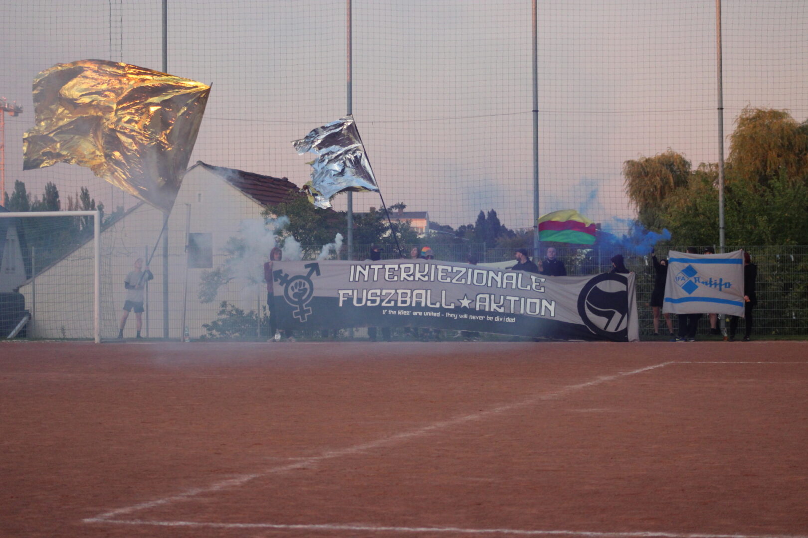 Besonders ereignisreich dürfte der Kicker:innen-Cup vor allem für die Veranstalterinnen gewesen sein. Neben der Fachstelle Mädchenarbeit, dem Genderkompetenzzentrum waren mehrere ehrenamtliche Frauen an der Organisation beteiligt. Eine der Organisatorinnen zeigte sich gegen über addn.me überwältigt von der Resonanz der Veranstaltung: „Ich habe mir das ganze Turnier kleiner und mit viel weniger Leuten vorstellt. Jetzt sind wir auf einen Fußballplatz mit richtig vielen Leuten, die auch alle gar nicht unbedingt spielen, sondern die Teams supporten, mit helfen und dafür sorgen, das wir hier einen richtig guten Tag hatten.“ Mit Rauch, Bannern und großen Fahnen sorgten vor allen die Fans der Interkiezonalen Fußballaktion (IFA) für viel Stimmung und optische Untermalung am Spielfeldrand. Black Wok und ein großes Mitbring-Buffet sorgten für die nötige Stärkung zwischen den Spielen, die durch DJ-Einlagen begleitet wurden. Der Umsonstladen Dresden hatte eine große Sammlung an Sportklamotten mitgebracht und zur freien Mitnahme angeboten, so dass manch Teilnehmer:in gut versorgt für die nächste Sportveranstaltung nach Hause gehen konnte.