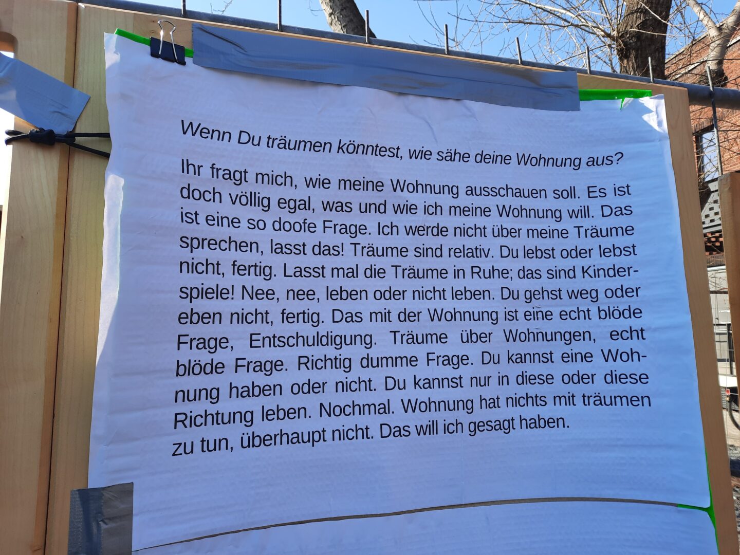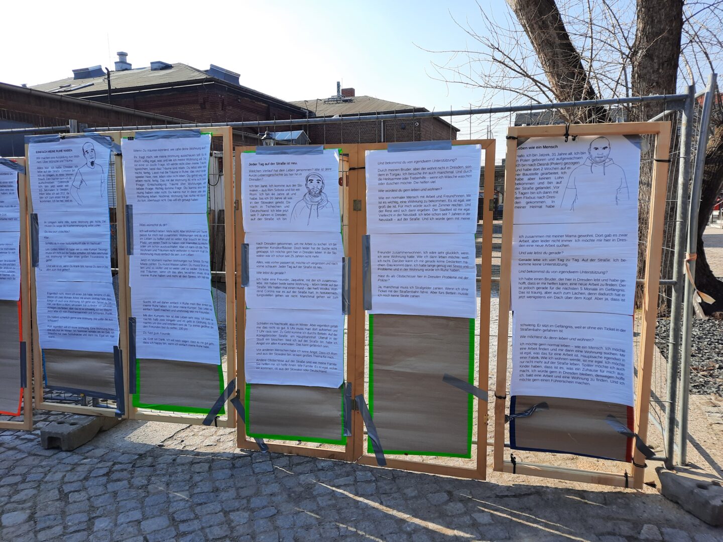 Nach den Bedürfnissen von Obdachlosen wird in der Regel nicht gefragt. Daher hat dies die BettelLobby getan und Interviews mit Obdachlosen in Dresden geführt. Ihre Antworten auf Fragen danach, wie sie im Moment leben, wie lange sie schon obdachlos sind, von wem sie Unterstützung bekommen, wie sie wohnen wollen und mit wem – waren ebenso Gegenstand der Ausstellung.